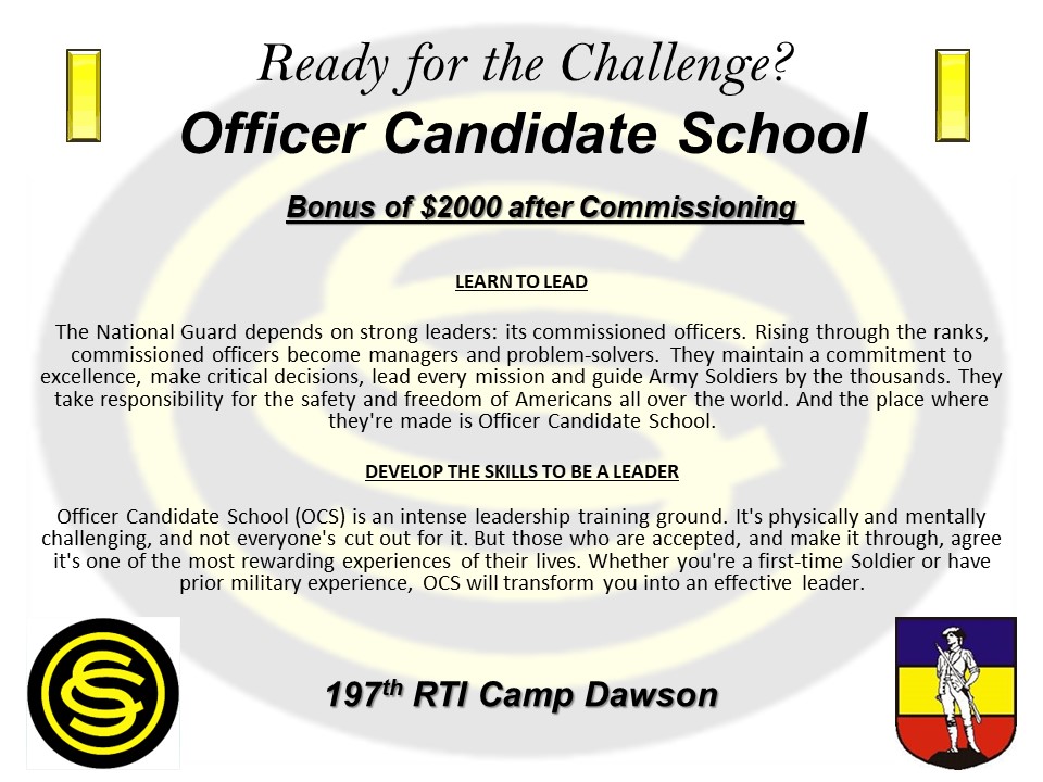 If you already have at least three years of college credit and you meet the eligibility requirements, you can join the West Virginia Army National Guard under the state Officer Candidate School enlistment option. Current National Guard soldiers and Prior Service soldiers who meet the eligibility criteria may also apply for state OCS.